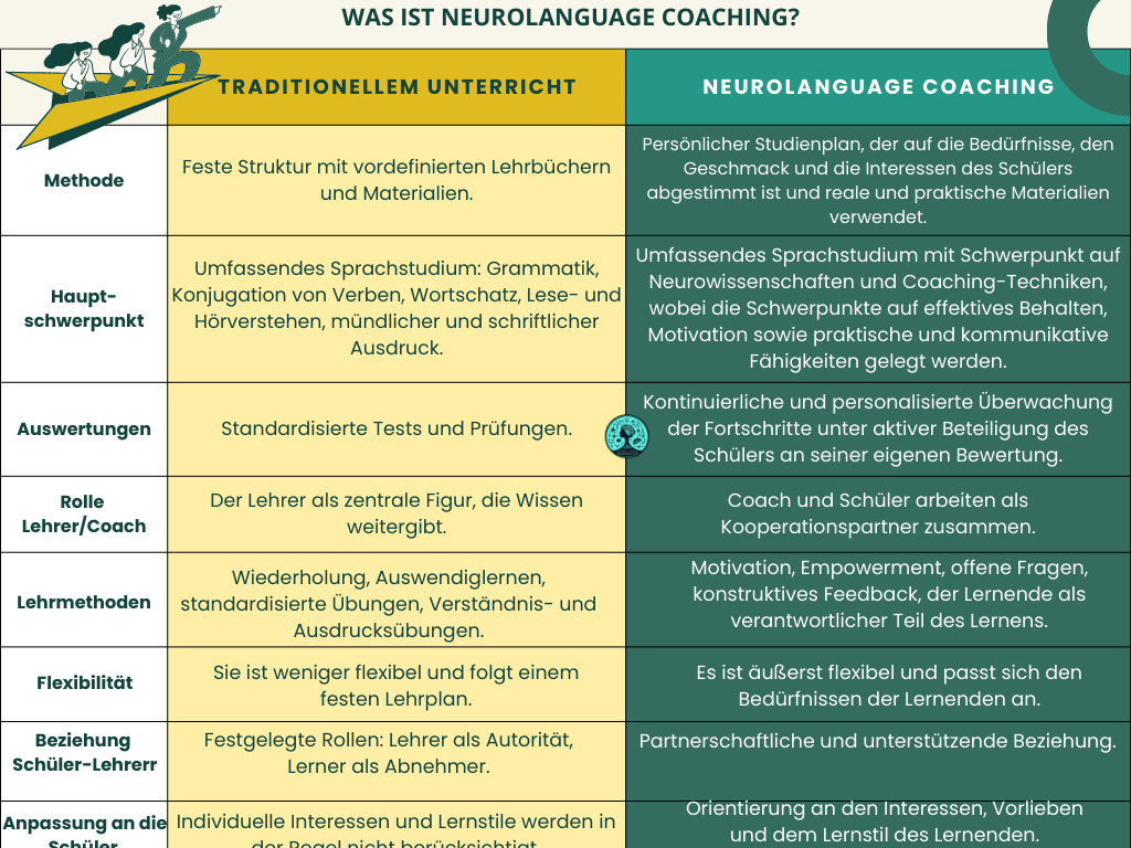 Im Gegensatz zum herkömmlichen Unterricht konzentriert sich Neurolanguage Coaching auf die Anpassung der Lehrmethoden an die individuellen Bedürfnisse des Schülers und nutzt neurowissenschaftlich fundierte Strategien, um schnelleres und effizienteres Lernen zu ermöglichen.
